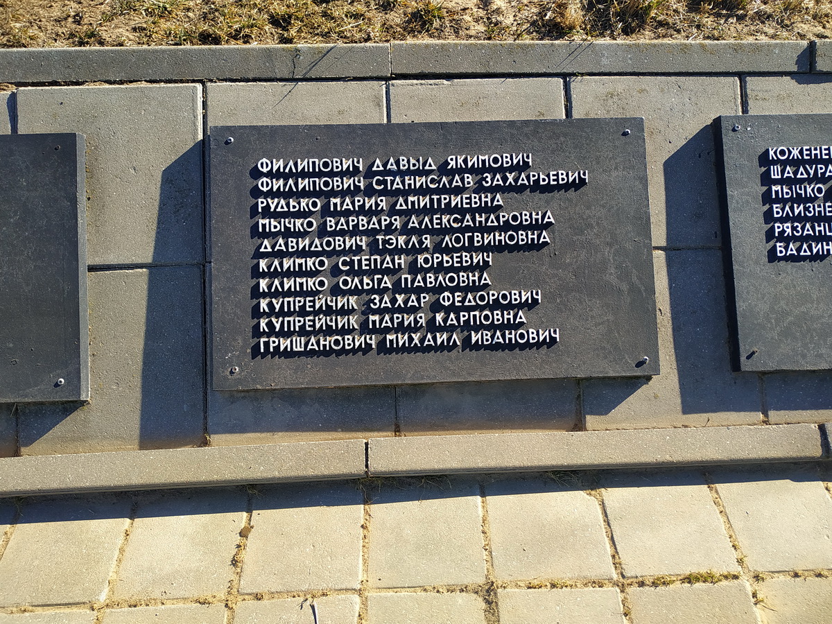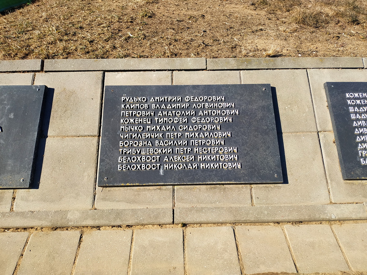 Вокруг могилы 22 плиты. На 19 плитах фамилии погибших, на двух – надписи – посвящения. Одна плита установлена в память землякам – воинам и партизанам, погибшим в годы войны.